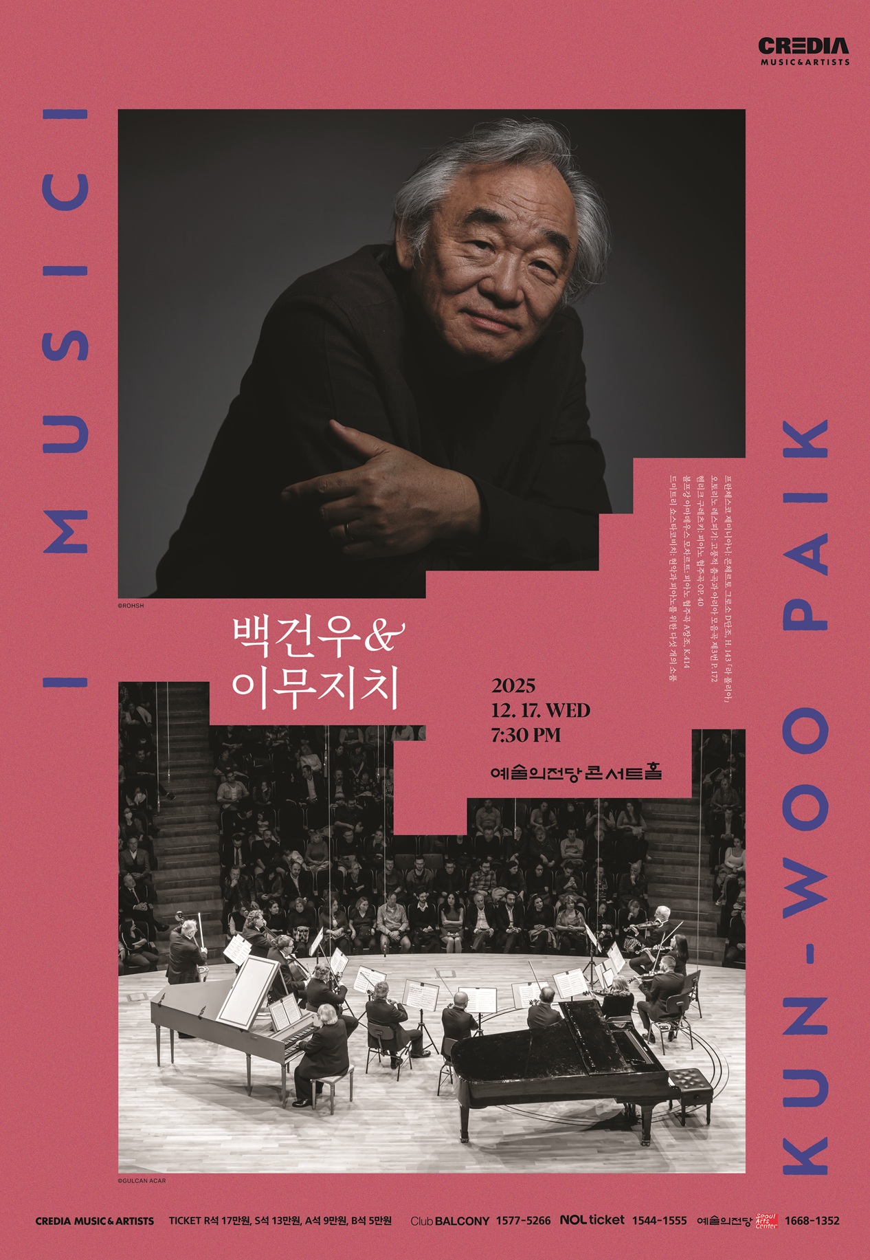 📌백건우 & 이 무지치 토스카니니가 극찬한 완벽한 앙상블, 건반 위의 구도자와 만나다 - 일시 : 12월 17일(수) 오후 7시 30분 - 장소 : 예술의전당 콘서트홀 - R석 17만원|S석 13만원ㅣ A석 9만원 ㅣ B석 5만원