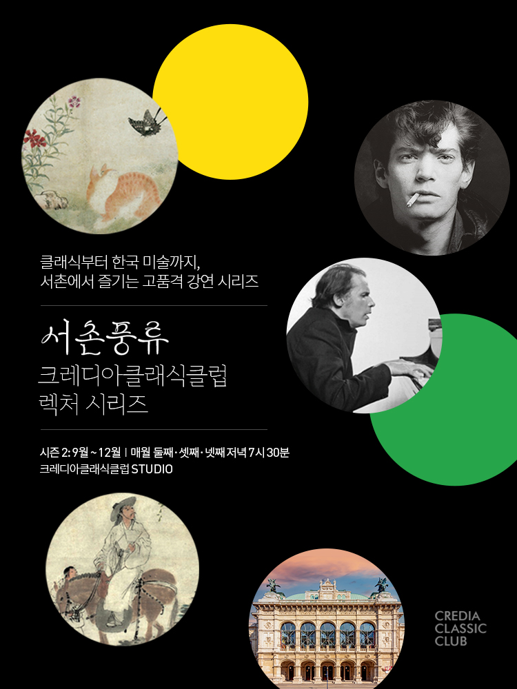 이 곳 크레디아클래식클럽 STUDIO에서 매주 목요일 밤을 멋지게 장식해주었던 렉처 시리즈 <서촌풍류>가 9월부터 시즌2로 다시 시작됩니다. 오픈과 동시에 전 회차 매진된 간송미술관 시리즈와 더불어, 오페라를 한층 친근하게 즐길 수 있게 해주는 <유정우의 ‘오페라 VIBE’> , 미술·영화·음악을 아우르며 인문학적 교양을 채워줄 <을유문화사의 ‘현대 예술의 거장’> 시리즈로 하반기를 더욱 풍요롭게 장식할 예정이라고 합니다.